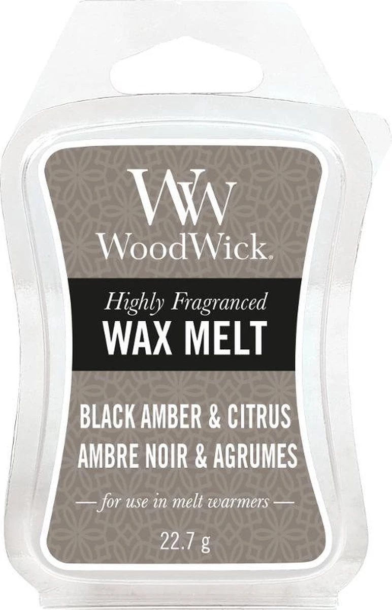 Met de Woodwick wax tabletten met de geur Black Amber & Citrus haal je een geur in huis die ruikt naar zwarte barnsteen met tonen van tabak, musk en mandarijn.