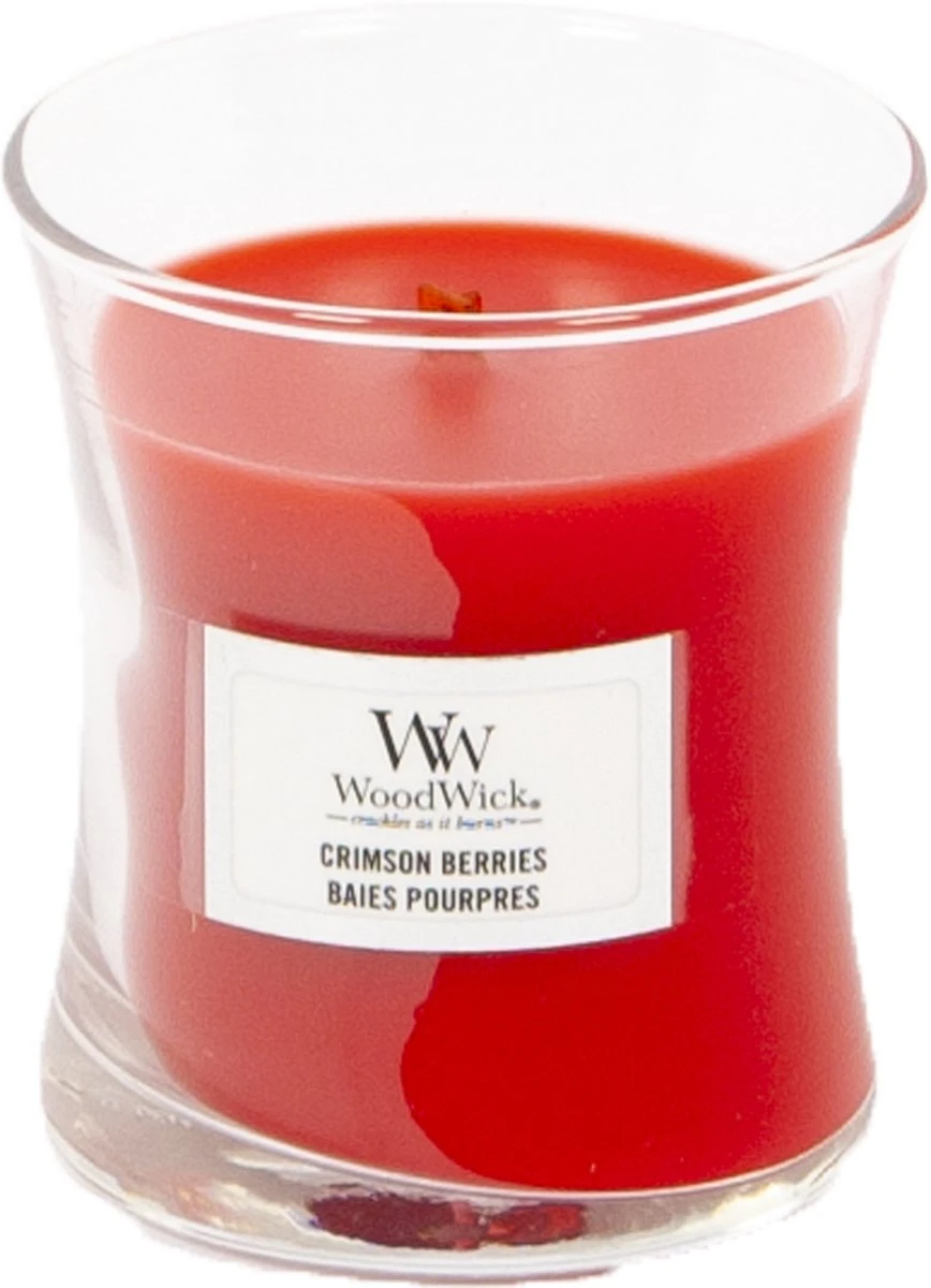 Met de medium Woodwick Crimson Berries kaars haal je de geur van sappige kersenbessen gemengd met hints van warme kruiden en maretakken in huis.