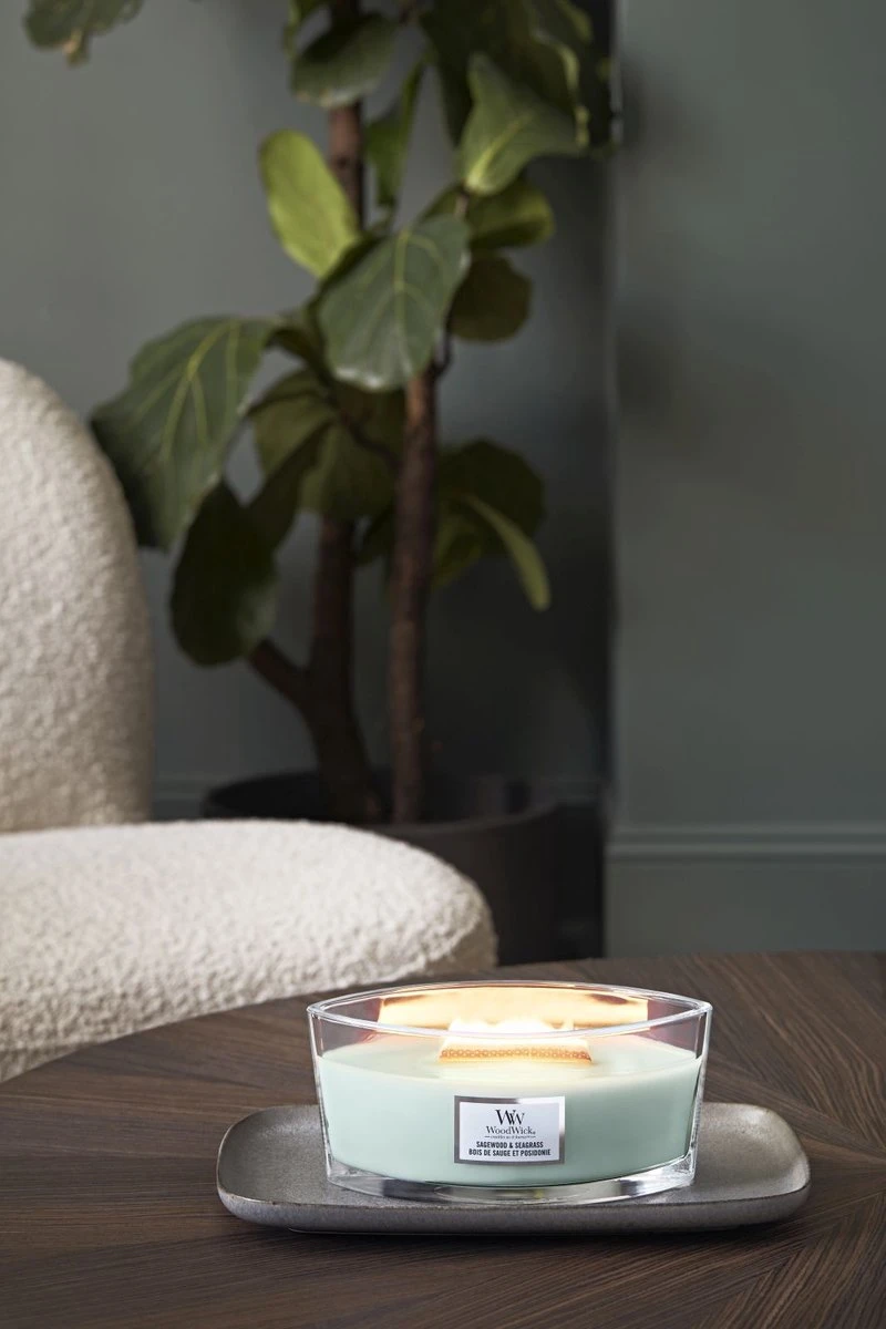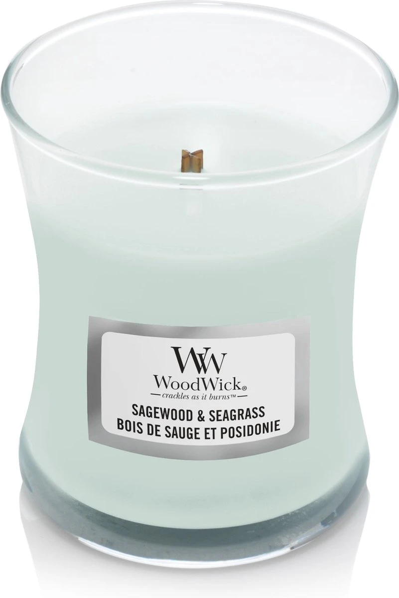 Met WoodWick Sagewood & Seagrass verspreid je de heerlijke geur van een luchtige, maar complexe combinatie van citrus, oceaan mineralen en witte salie noten door je huis. Daarnaast geeft de houten lont een rustgevend knisperend geluid, alsof de haard aanstaat. Time to relax. Met deze WoodWickgeurkaars geniet je ongeveer 20 branduren van een heerlijk geurende kaars, die alle zintuigen prikkelt.