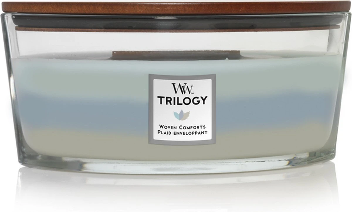| Verpakkingsinhoud | WoodWick Geurkaars Ellipse Trilogy Woven Comforts – 9 cm / 19 cm |
