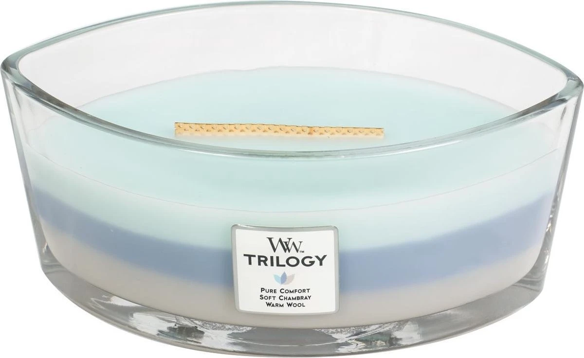 WoodWick Kaars Ellipse Trilogy Woven Comforts kopen?Stel je voor: na een lange dag kom je thuis, ploft op de bank en steekt de kaarsen aan voor wat extra gezelligheid. Wie wil er dan niet een heerlijke, huiselijke geur ruiken zodra de kaarsen aan het branden zijn? Geniet van een trilogy van de geuren Pure Comfort, Soft Chambray en Warm Wool. De houten lont geeft een rustgevend knisperend geluid, alsof de haard aanstaat. Time to relax. Met deze WoodWick geurkaars geniet je ongeveer 50 branduren van een heerlijk geurende kaars, die alle zintuigen prikkelt. WoodWick Trilogy Woven Comforts GeurbelevingDeze kaars bevat 3 geuren die je stuk voor stuk kunt ruiken, maar zich ook heerlijk mengen.De geuren zijn: Pure Comfort: De geur van aan de waslijn gedroogde linnen met hints van puur fruit en musk van satijn. Soft Chambray: Ontspannend en schoon, deze geur omhult de zintuigen met zachte stof en een subtiele kus van jasmijn en roos. Warm wool: Dromerige geuren van warm wol en wilde bloemen voor de perfecte finishing touch in elke ruimte.