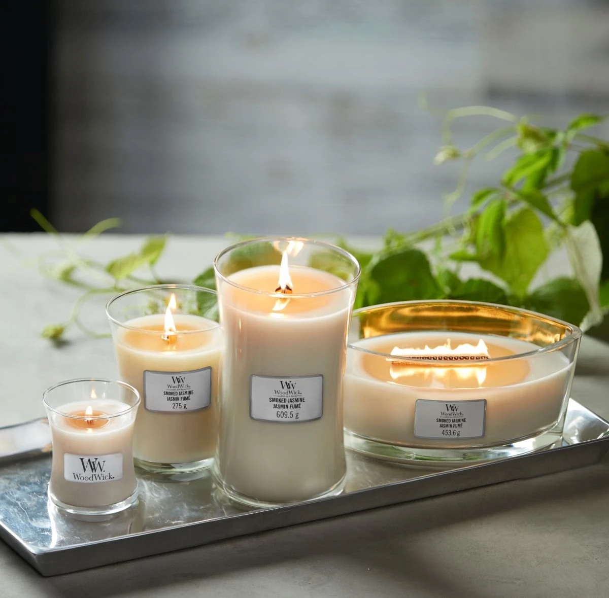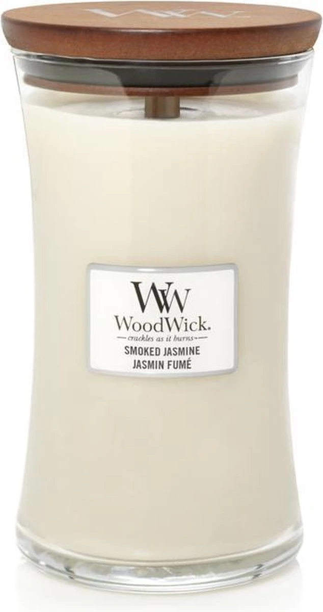 WoodWick Kaars Large Smoked Jasmine kopen?Geniet met WoodWick Jasmine van de aroma’s van delicate jasmijnblaadjes, verweven met warme ceder en rokerige wierook. Daarnaast geeft de houten lont een rustgevend knisperend geluid, alsof de haard aanstaat. Time to relax. Met deze WoodWick geurkaars geniet je ongeveer 130 branduren van een heerlijk geurende kaars, die alle zintuigen prikkelt. Topnoten: ananas, limoen en grapefruit Hartnoten: jasmijn en kamperfoelie Basisnoten: cederhoutWil je meer weten over de verschillende geurnoten? Bekijk dan hier onze keuzegids.