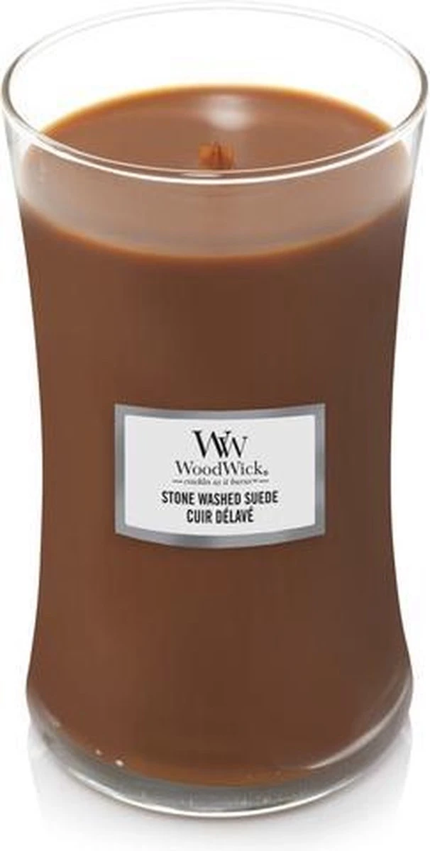 Met de grote Woodwick Stone Washed Suede kaars haal je de geuren van vurige peper, zoete jasmijn en verleidelijke amber brengen de vertrouwde geur van steengewassen suede tot leven. Waan je in een leder waren winkel met deze Woodwick kaars.