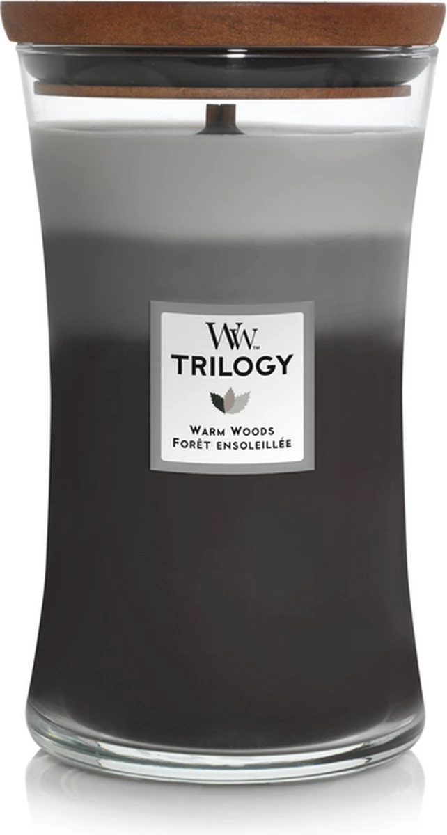 De WoodWick Trilogy Hourglass Large geurkaars – Warm Woods creëert een unieke geurbeleving terwijl de lagen samensmelten.
