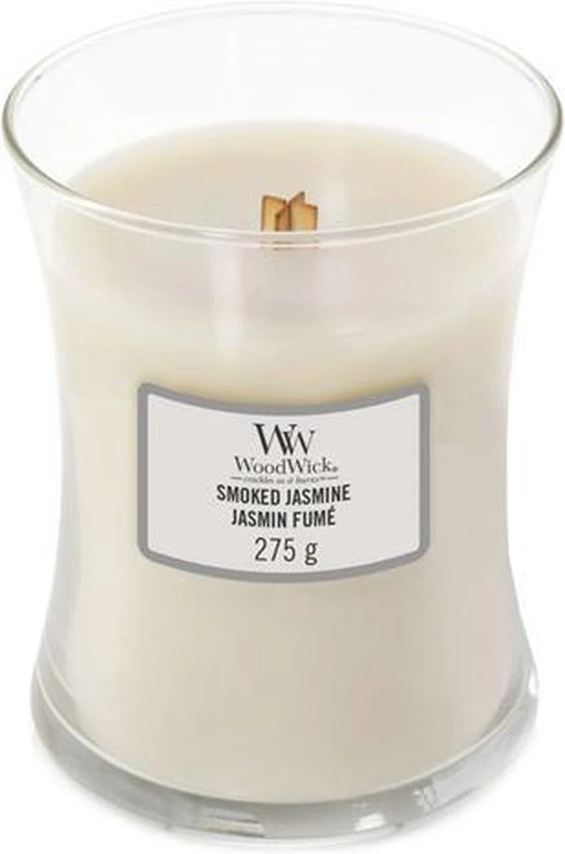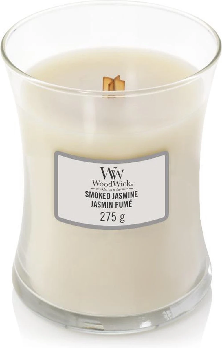 WoodWick Kaars Medium Smoked Jasmine kopen?Geniet met WoodWick Jasmine van de aroma’s van delicate jasmijnblaadjes, verweven met warme ceder en rokerige wierook. Daarnaast geeft de houten lont een rustgevend knisperend geluid, alsof de haard aanstaat. Time to relax. Met deze WoodWick geurkaars geniet je ongeveer 90 branduren van een heerlijk geurende kaars, die alle zintuigen prikkelt. Topnoten: ananas, limoen en grapefruit Hartnoten: jasmijn en kamperfoelie Basisnoten: cederhoutWil je meer weten over de verschillende geurnoten? Bekijk dan hier onze keuzegids.