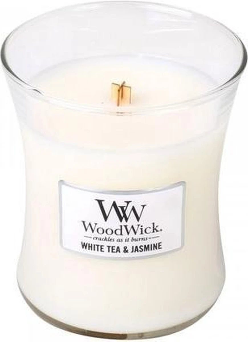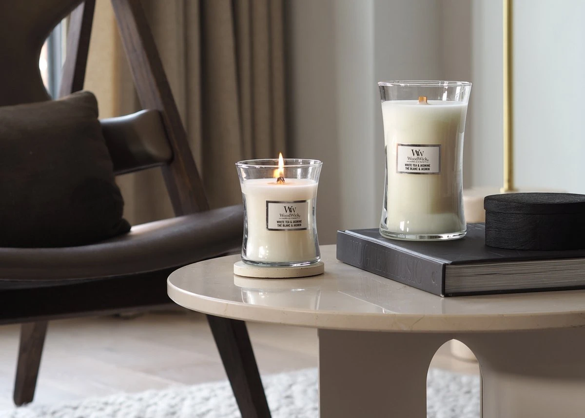 Woodwick Hourglass Medium Geurkaars – White Tea & Jasmine