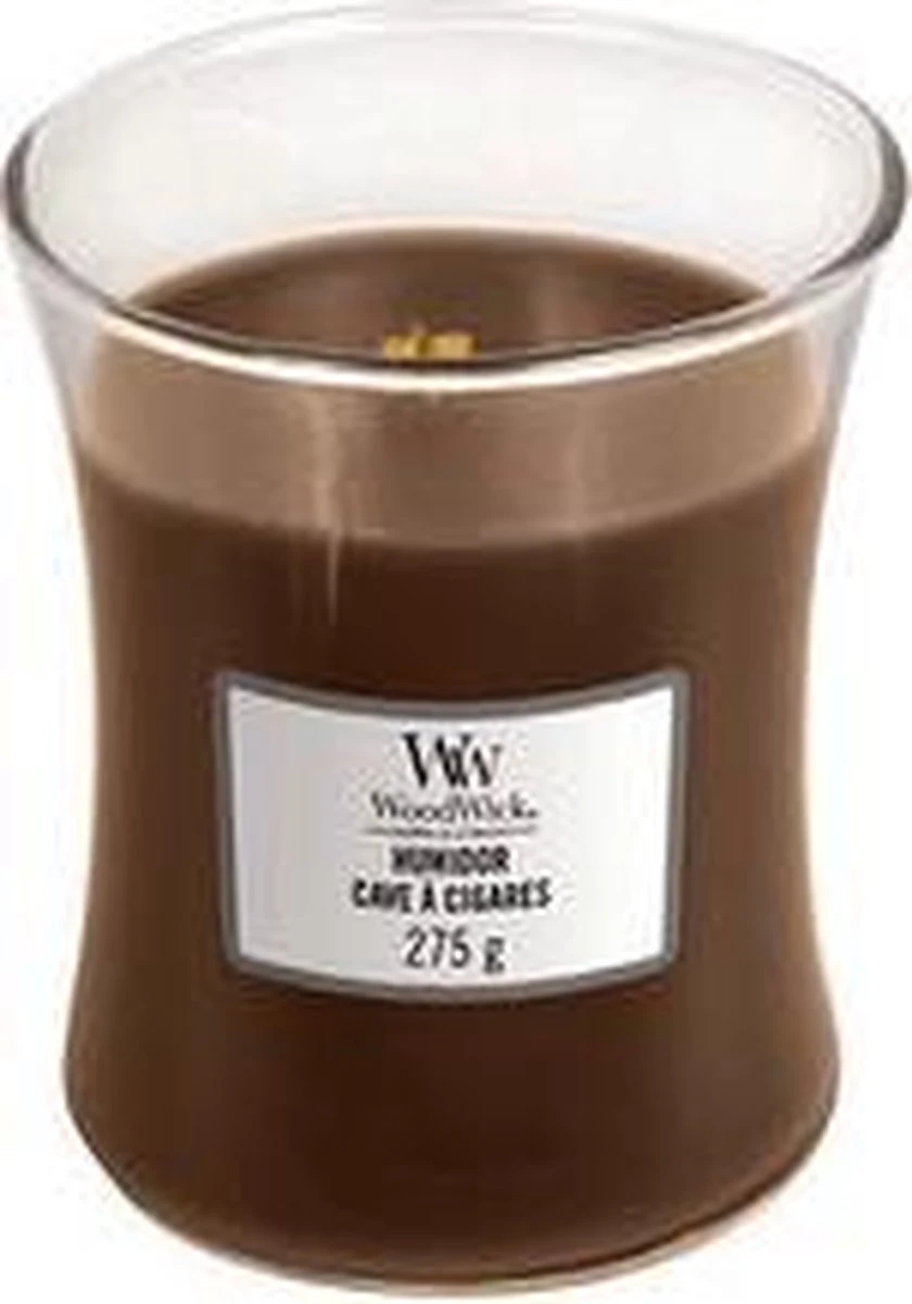 Met de kleine Woodwick Humidor kaars haal je de geur van tabaksbladeren, zachte suede en perzikbloesem in huis. Verwen jezelf met deze zware luxe geur en relax.