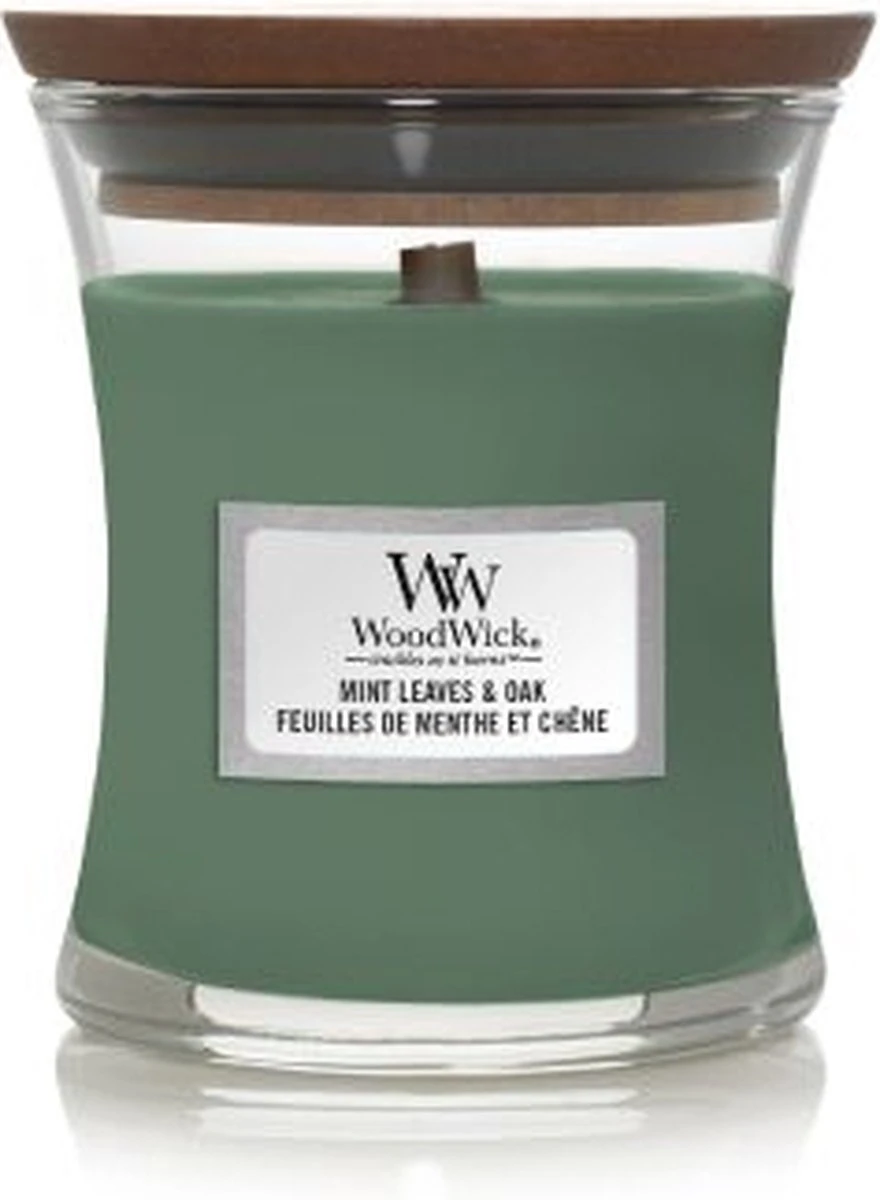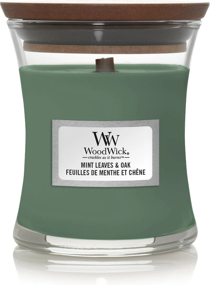 De WoodWick Hourglass Mini geurkaars – Mint Leaves & Oak heeft een geur van verse muntblaadjes gemengd met een houtachtige mix van groen mos, gerookte eik en cipres.