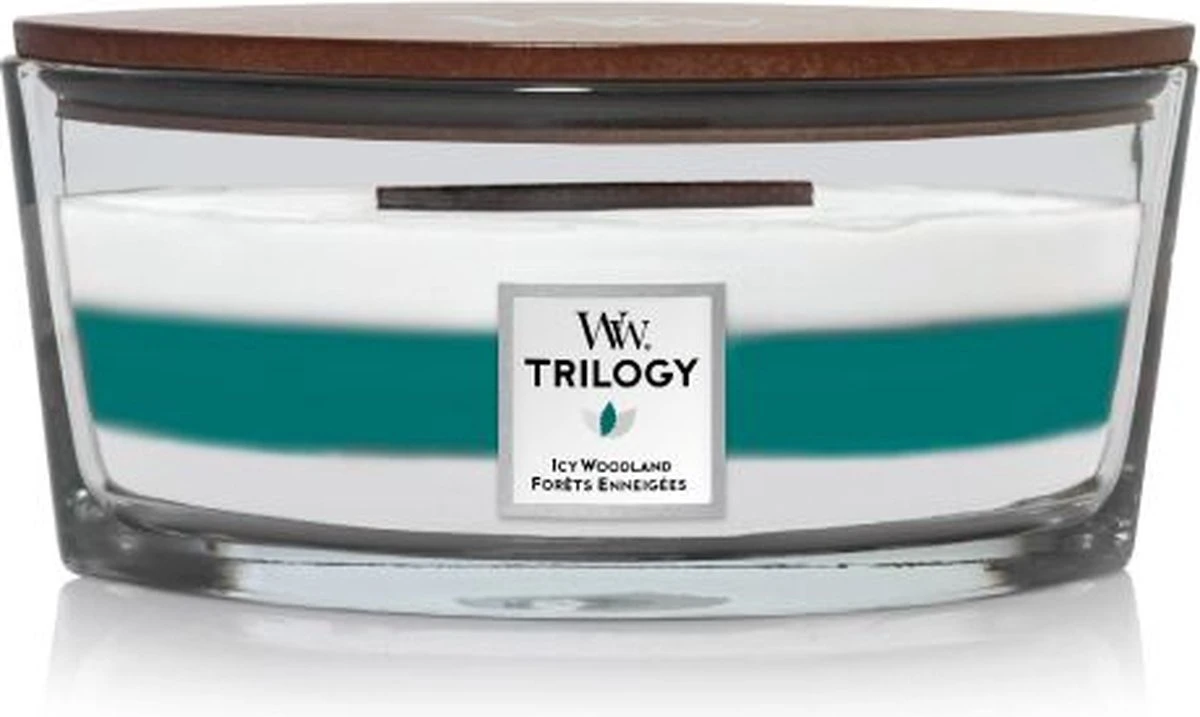 De WoodWick Trilogy Heartwick Flame Ellipse geurkaars – Icy Woodland creëert een unieke geurbeleving terwijl de lagen samensmelten.